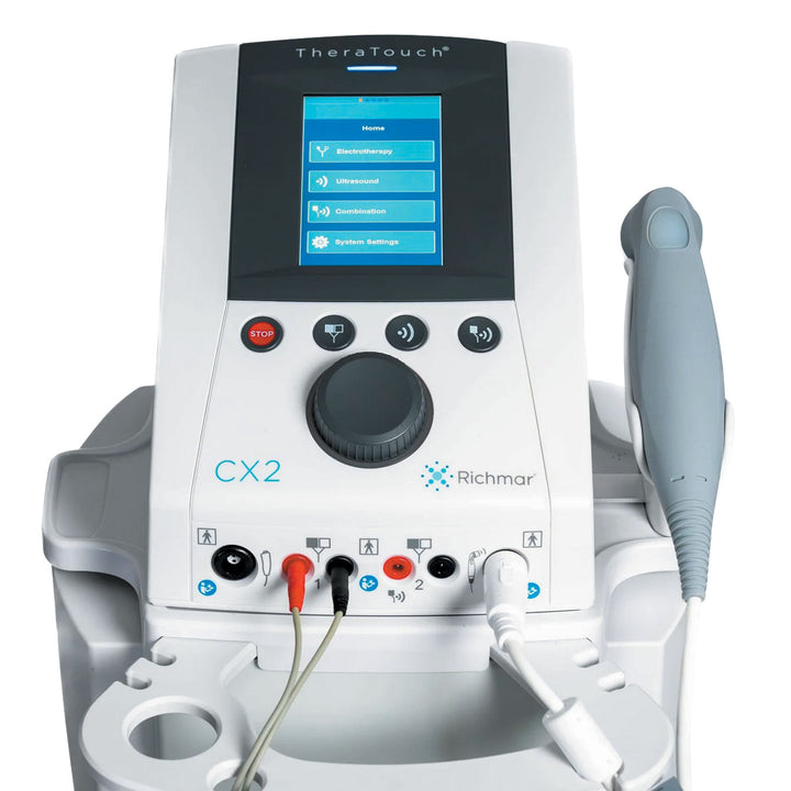 This portable electrotherapy and ultrasound system offers practitioners a wide range of treatment options in one user-friendly, ergonomic design. The rechargeable battery allows flexibility in treatment location. Equipped with a full color, menu driven touch screen and bilingual interface, the TheraTouch CX2 guides you step by step when setting up treatments manually or when selecting from predefined clinical protocols; all with editable parameters. The therapeutic ultrasound can be used in combination with electrotherapy through the sound head or independently with different treatments running simultaneously. The CX2 also includes a patient remote button allowing patients to stop treatments if needed while the clinician is away.